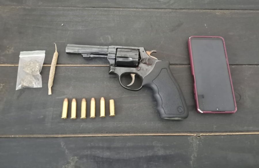No rastro da fuga, o indivíduo deixou para trás uma pochete e um revólver calibre .38, que foi apreendido juntamente com cinco munições intactas e uma deflagrada. Também foram recolhidos um celular, uma bucha e uma porção de substância análoga à maconha.